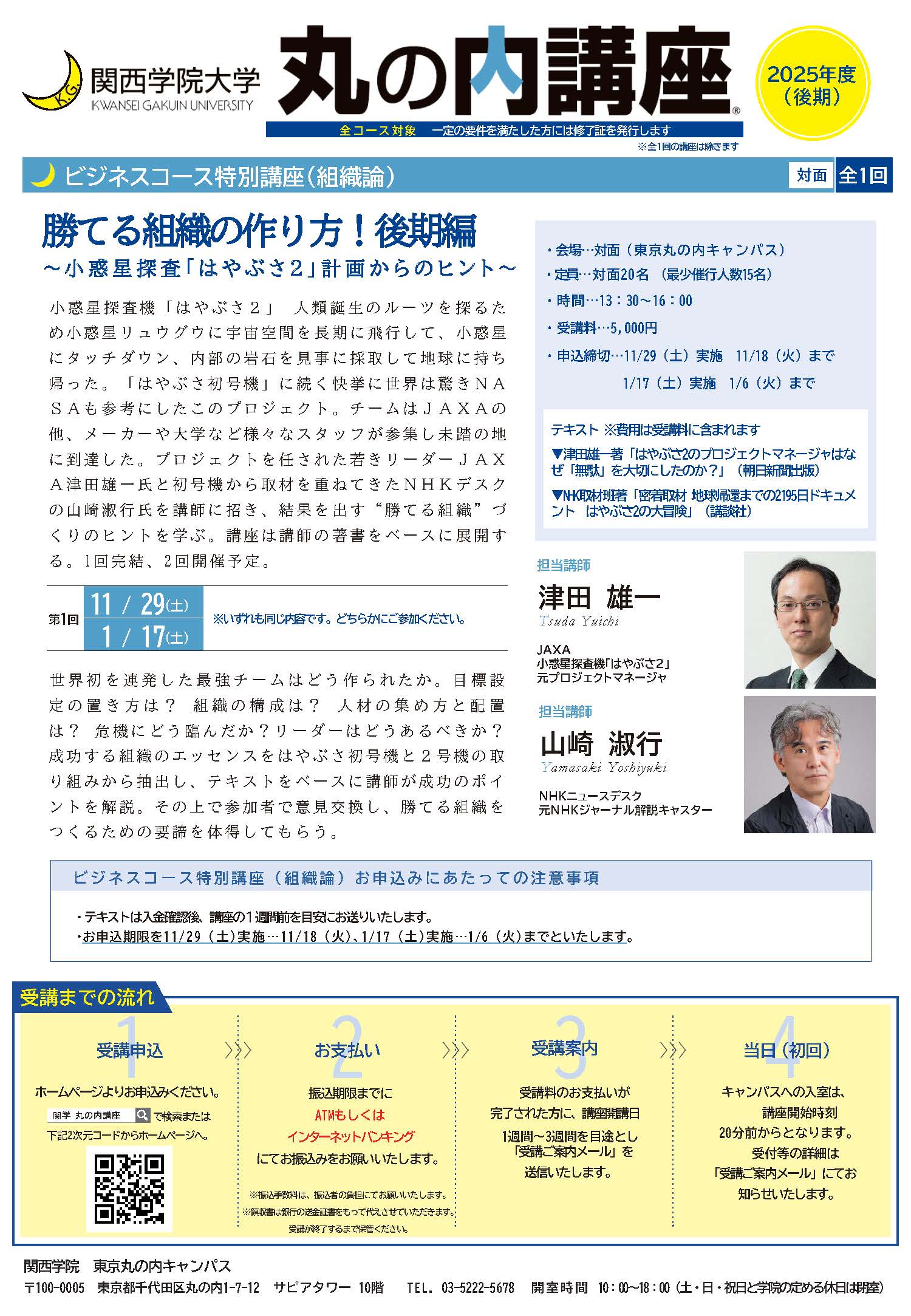 小惑星探査機「はやぶさ2」 人類誕生のルーツを探るため小惑星リュウグウに宇宙空間を長期に飛行して、小惑星にタッチダウン、内部の岩石を見事に採取して地球に持ち帰った。「はやぶさ初号機」に続く快挙に世界は驚きNASAも参考にしたこのプロジェクト。チームはJAXAの他、メーカーや大学など様々なスタッフが参集し未踏の地に到達した。プロジェクトを任された若きリーダーJAXA津田雄一氏と初号機から取材を重ねてきたNHKデスクの山崎淑行氏を講師に招き、結果を出す“勝てる組織”づくりのヒントを学ぶ。講座は講師の著書をベースに展開する。1回完結、2回開催予定。