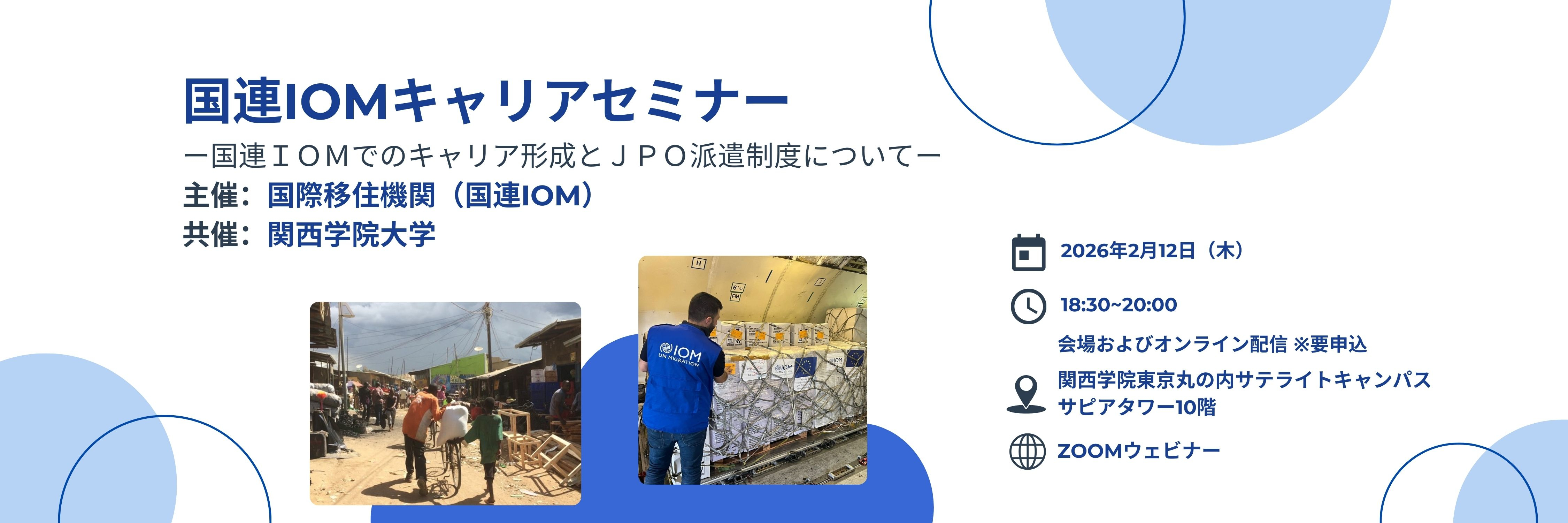 本セミナーでは、国連IOMが担う具体的な支援活動や組織の特徴、国際機関でのキャリア形成について紹介するとともに、JPO派遣制度を活用したキャリアパスについての情報をお届けします。外務省 国際機関人事センターよりJPO派遣制度の概要をご説明いただくほか、国連IOMでJPOを経験した現役職員が登壇し、自身の経験を交えながら「国連IOMで働くとはどういうことか」をリアルにお伝えします。